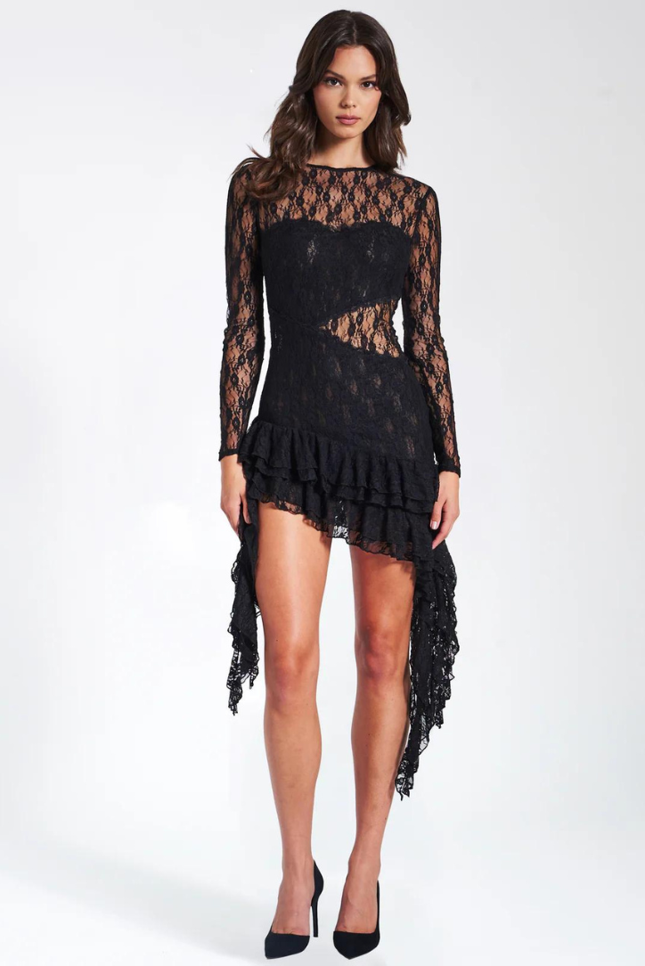 Feminine and flirty, the Brielle Lace Mini Dress is made to turn heads. Featuring tiered ruffles in delicate lace with a playful waist cut-out illusion and daring open back, this dreamy mini is perfect for everything from brunch dates to nights out.
