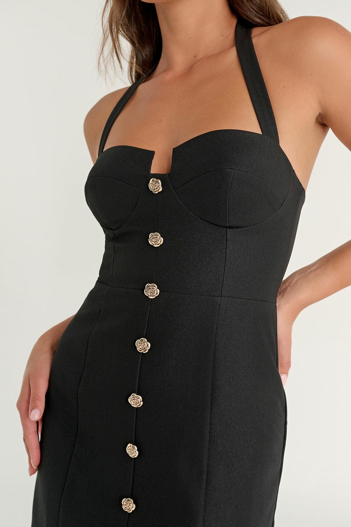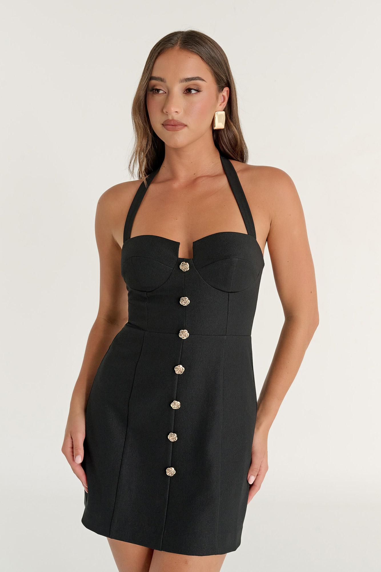 Turn heads in the Charisma Mini Dress, a playful yet elegant piece with statement detailing. Featuring a chic halter neckline and gold rose buttons down the front, this mini blends sophistication with a flirty edge. Perfect for nights out, parties, or your next special occasion.
