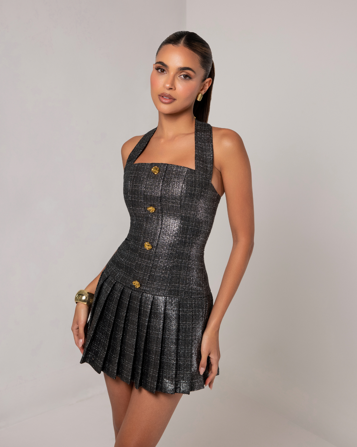 Elevate your style with the Charlene Mini Dress, where classic tweed meets a modern, glamorous twist. Metallic accents shimmer subtly throughout the fabric, creating a chic, eye-catching finish. Its flared silhouette and mini length make it effortlessly flattering and perfect for day-to-night occasions.