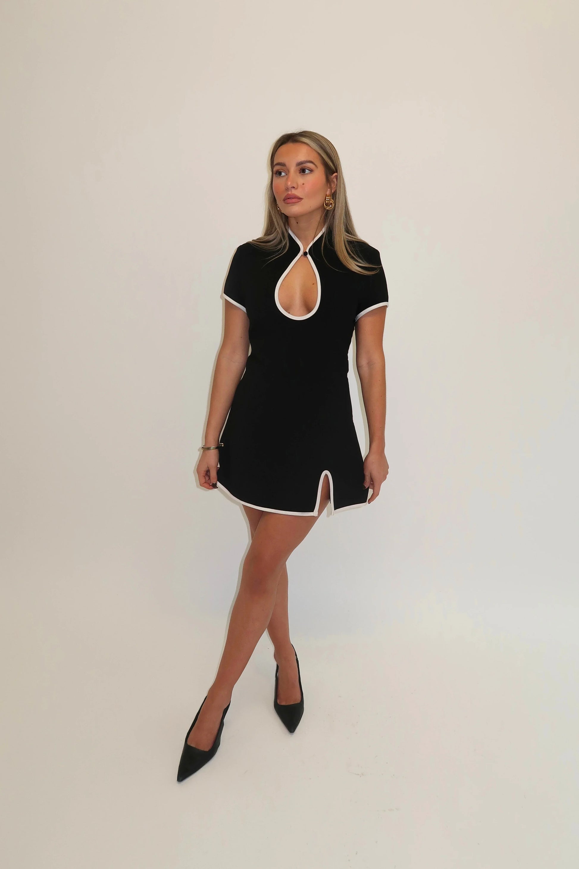 Chic and sophisticated with a modern edge, the Hannah High Neck Mini Dress is a timeless piece you’ll wear on repeat. Featuring a sleek high neckline with crisp white binding and a flattering mini cut, this style is elevated by its statement lace-up back for an unexpected twist. Perfect for nights out, parties, or special occasions where effortless style is a must.
