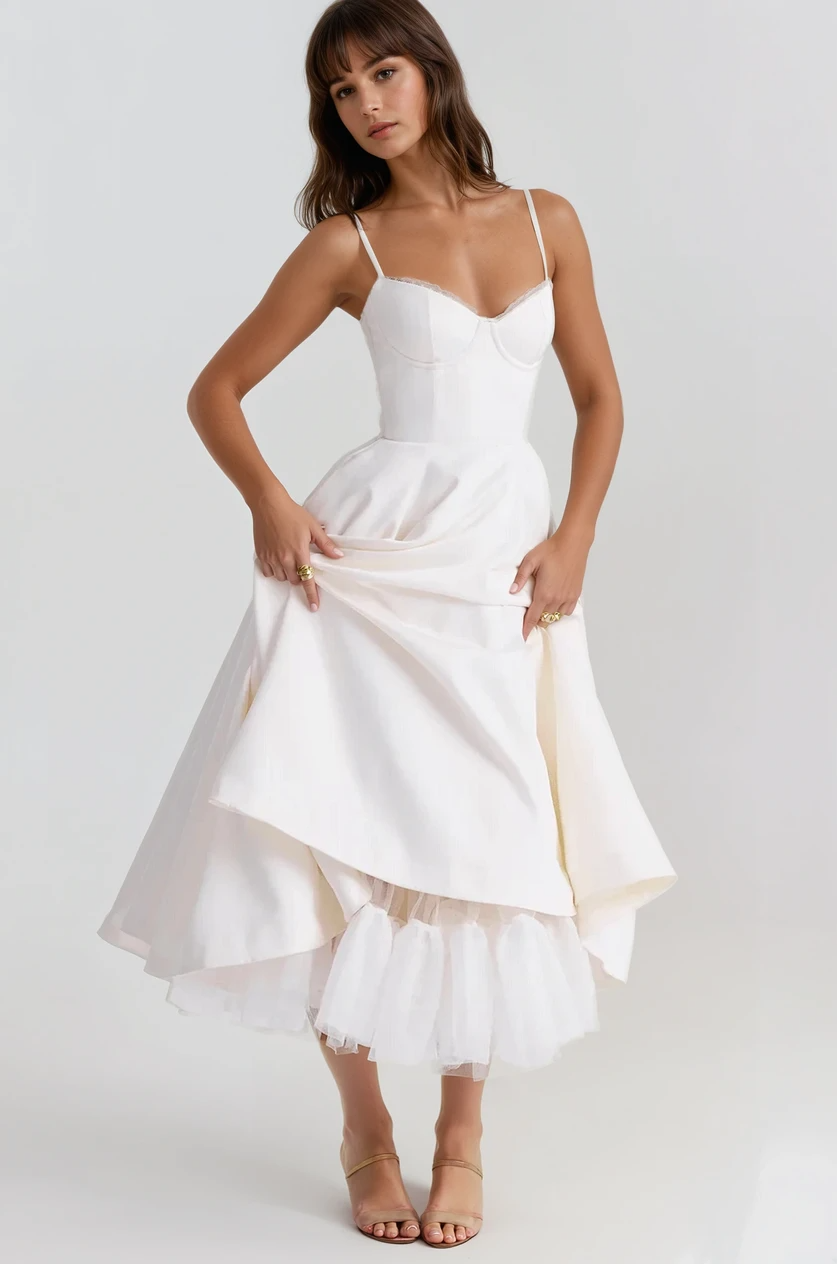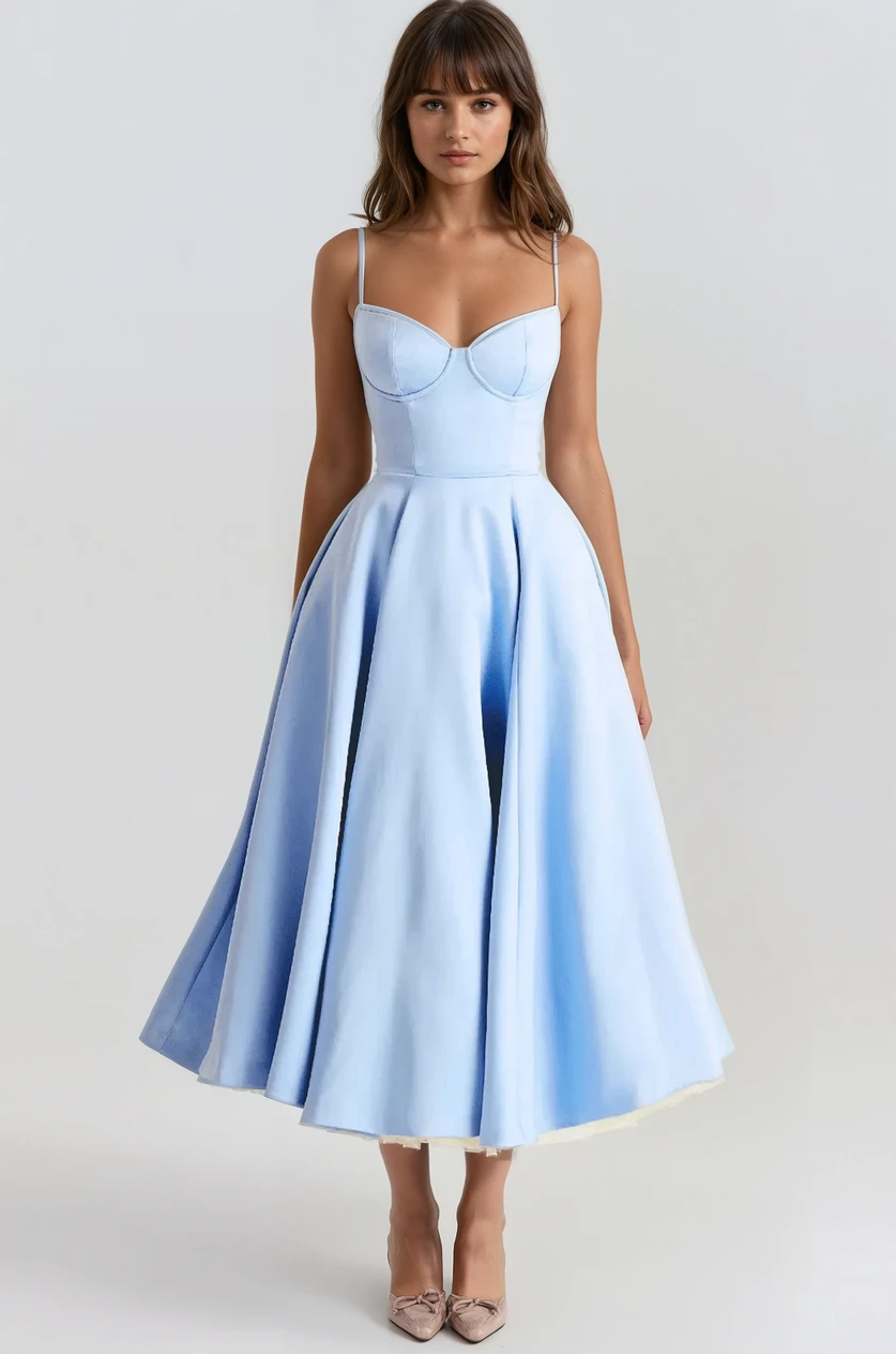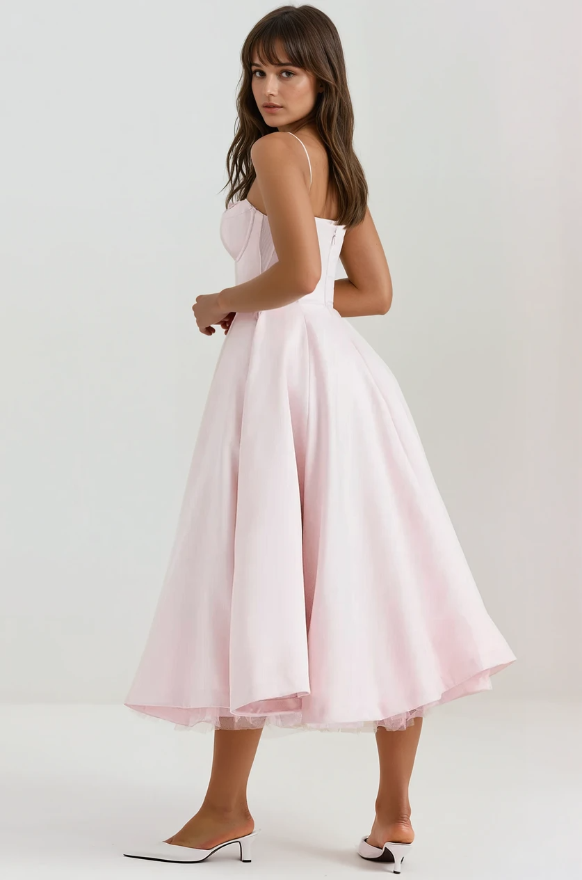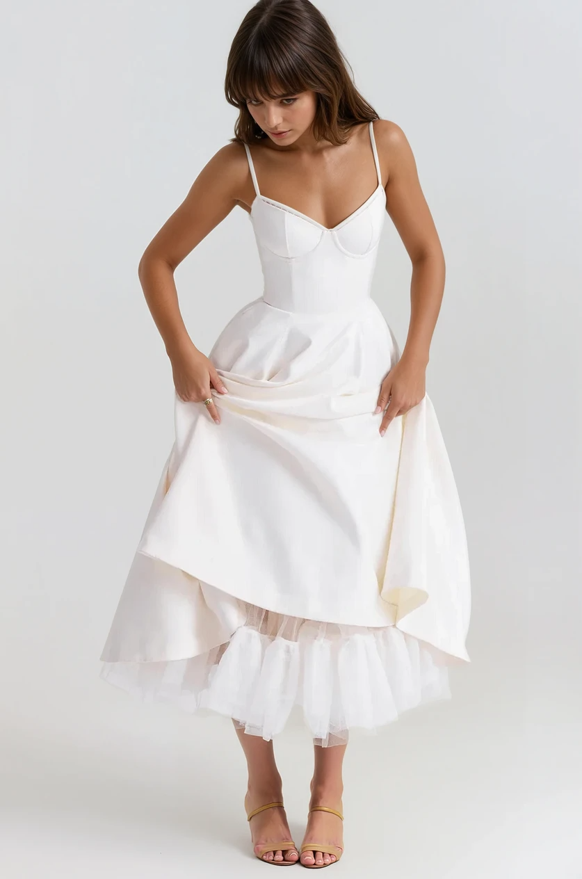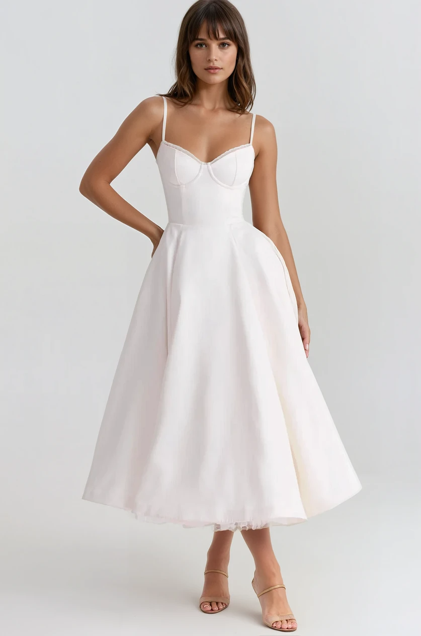 The Judy Midi Dress is a true fairytale moment. Designed with a sculpted bodice and sweetheart neckline, this dreamy piece combines timeless romance with modern elegance. With underwired cups, adjustable straps, and a cinched waist, it delivers the perfect fit while creating a feminine, flattering silhouette.