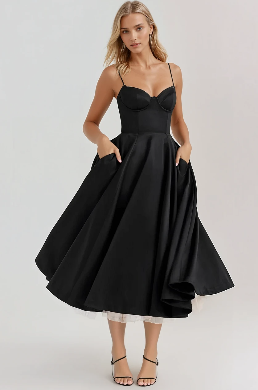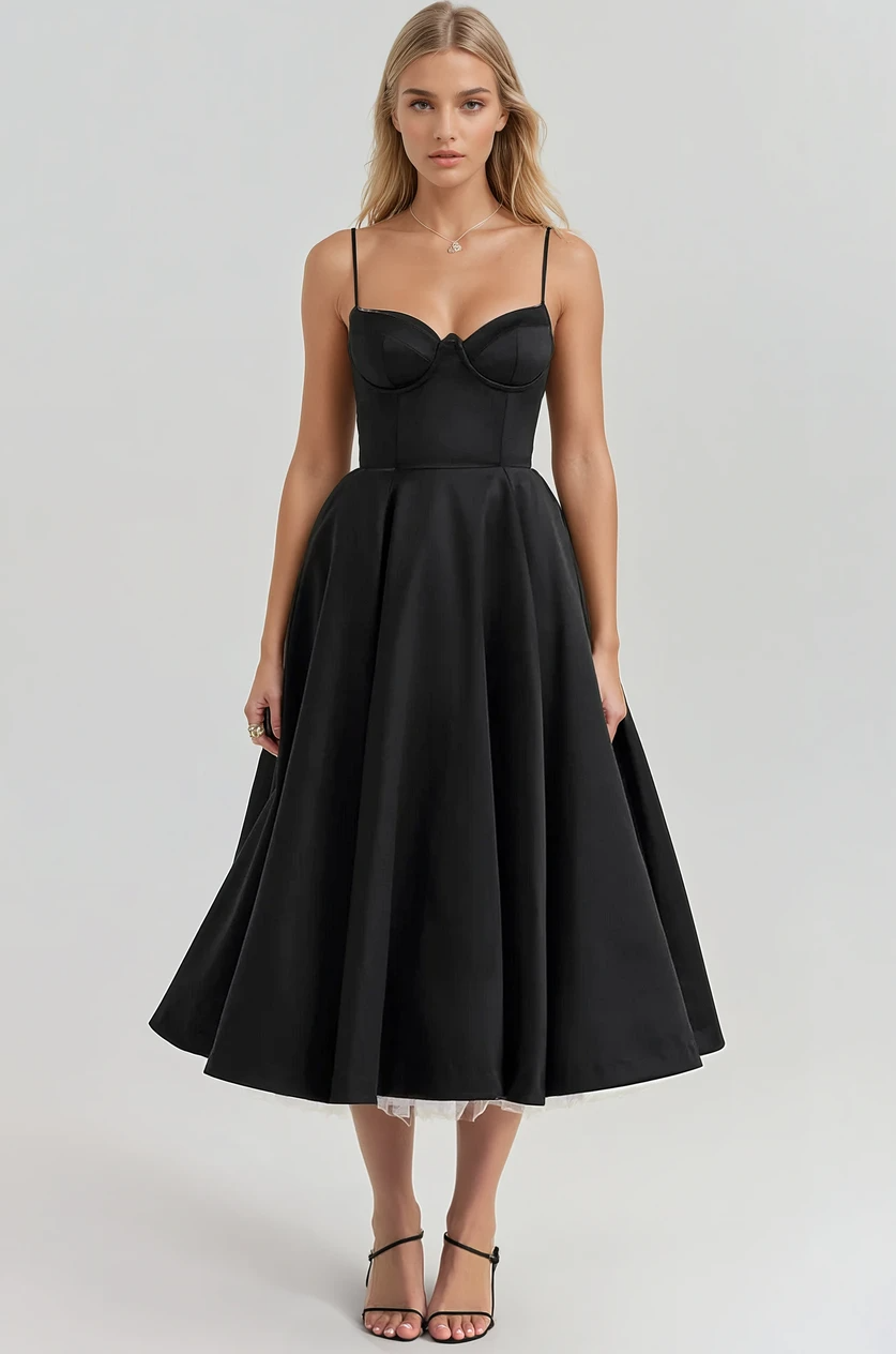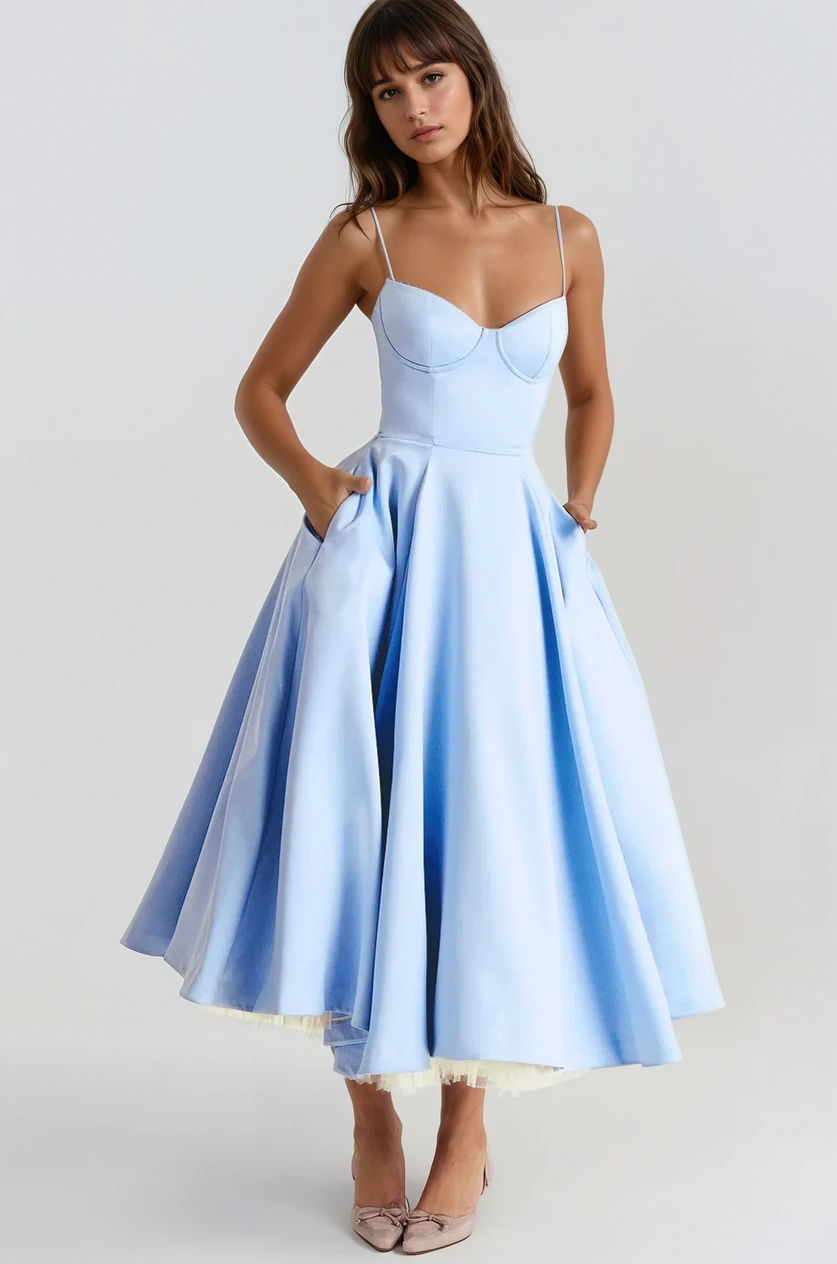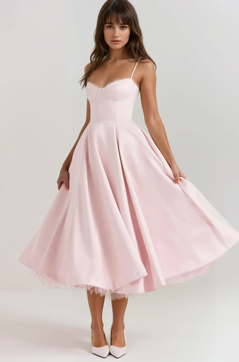The Judy Midi Dress is a true fairytale moment. Designed with a sculpted bodice and sweetheart neckline, this dreamy piece combines timeless romance with modern elegance. With underwired cups, adjustable straps, and a cinched waist, it delivers the perfect fit while creating a feminine, flattering silhouette.