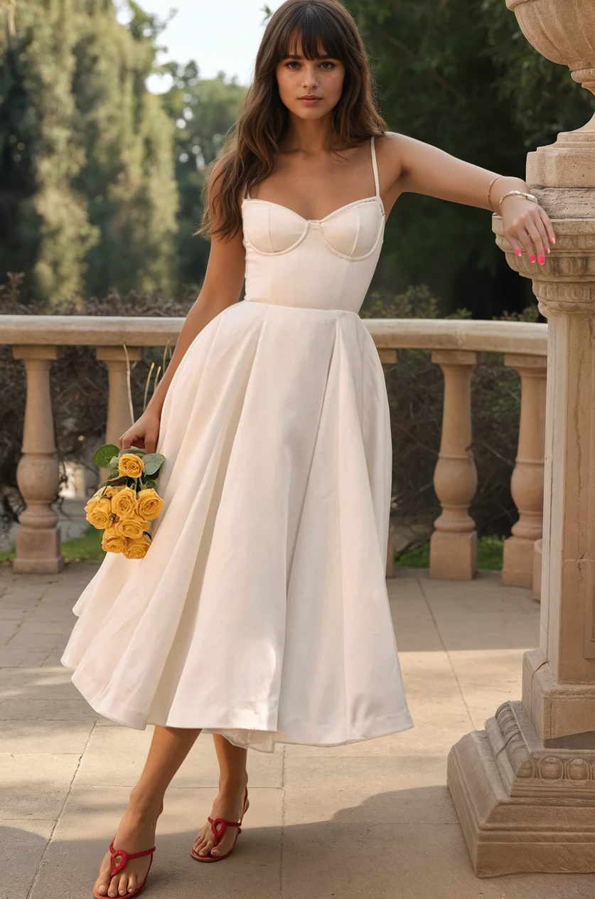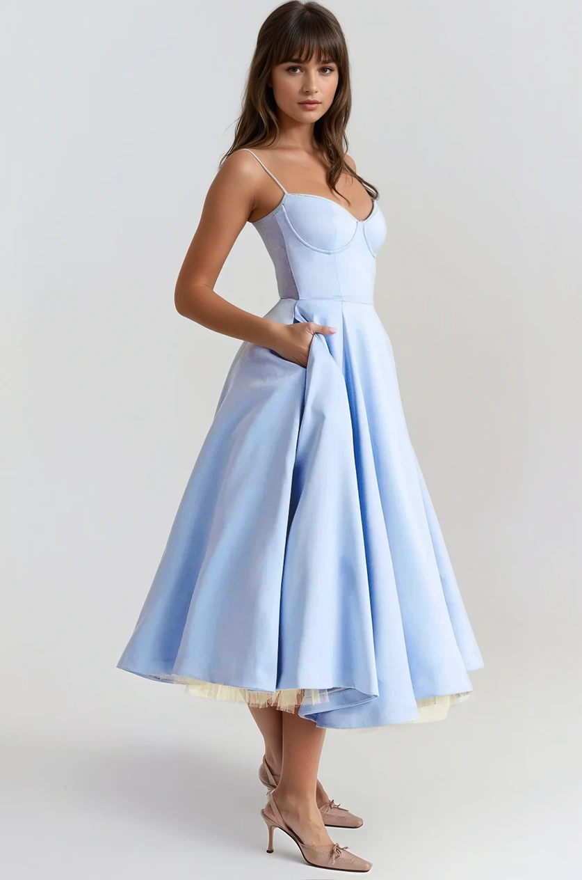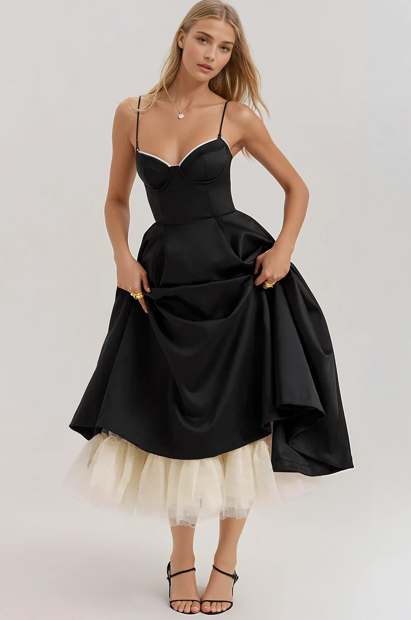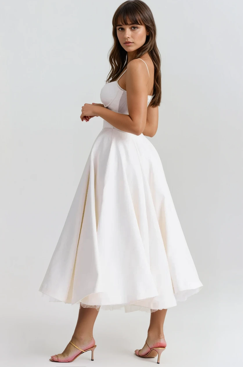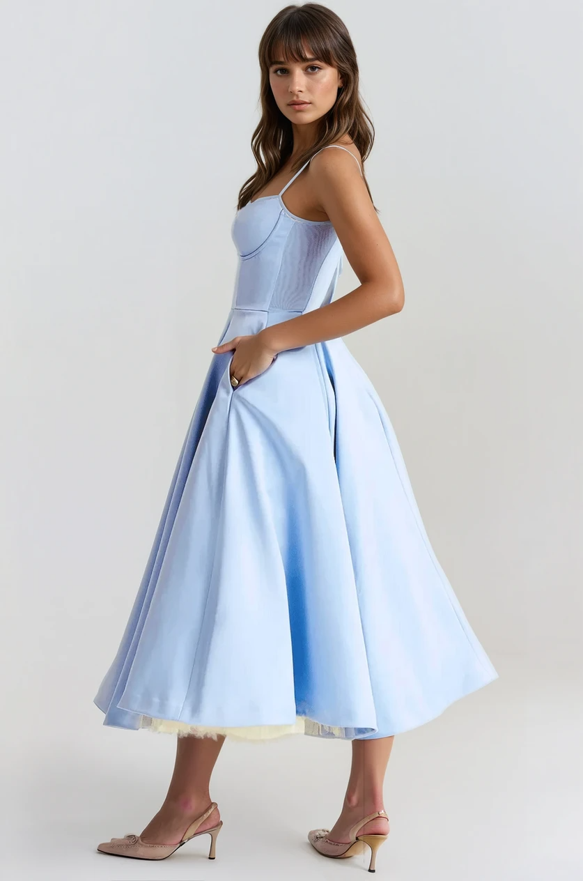 The Judy Midi Dress is a true fairytale moment. Designed with a sculpted bodice and sweetheart neckline, this dreamy piece combines timeless romance with modern elegance. With underwired cups, adjustable straps, and a cinched waist, it delivers the perfect fit while creating a feminine, flattering silhouette.