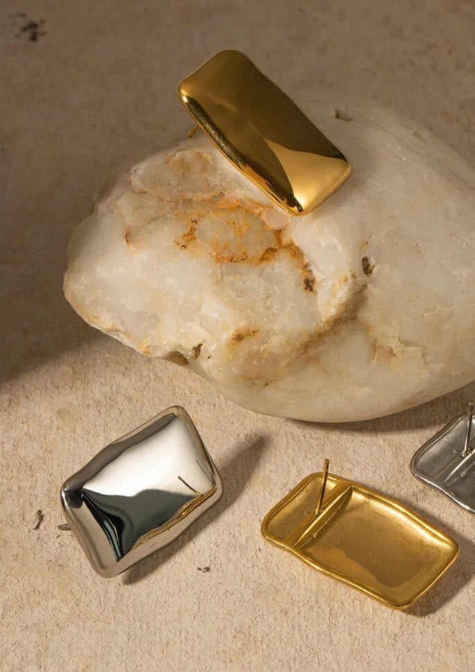 The Juliette Earrings feature a bold distorted rectangular shape crafted from stainless steel with a polished gold finish. Designed for all-day wear, they add a modern edge to any outfit. Finished with a butterfly stud fastening for secure wear.